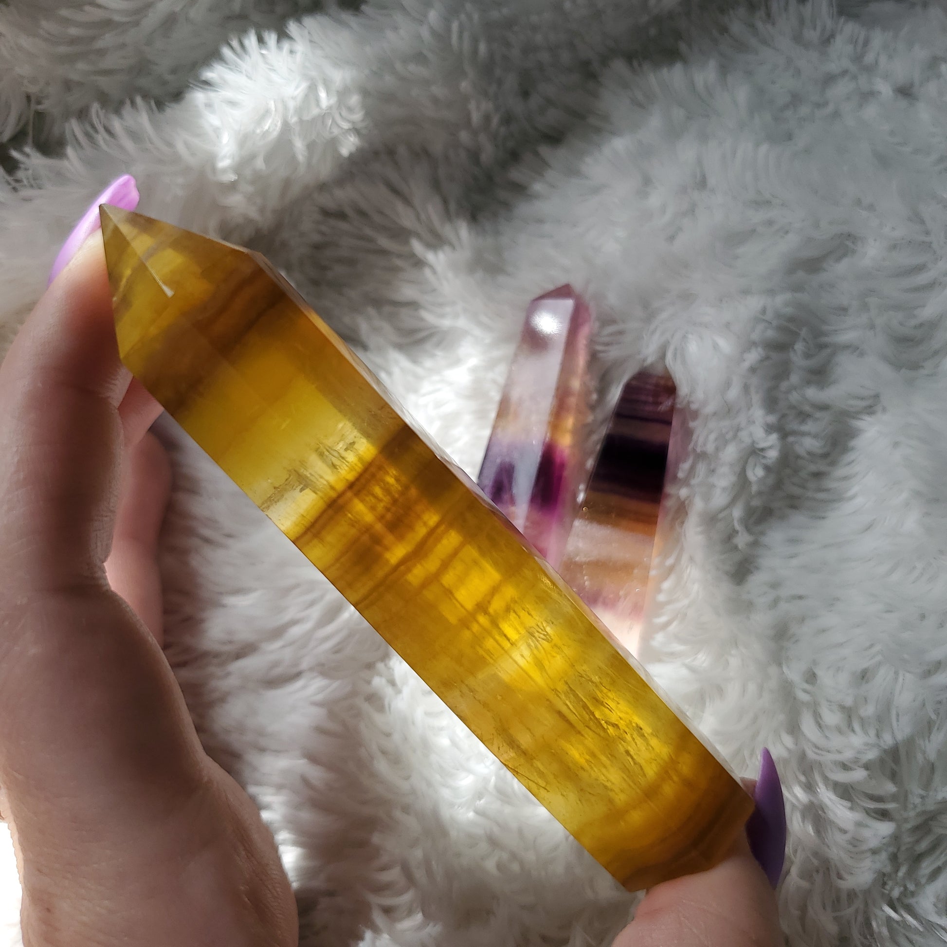 Big dark yellow banding fluorite tower with 2 smaller tiny baby towers. Purple, yellow, pink candy fluorite tower rainbows brings out inner child